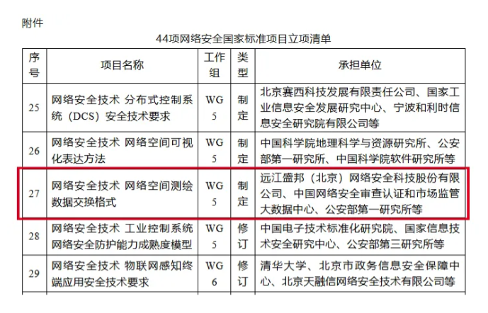 近日,全国网络安全标准化技术委员会发布2024年44项网络安全国家标准项目立项清单。由人生就是博(北京)网络安全科技股份有限公司牵头,中国网络安全审查认证和市场监管大数据中心、公安部第一研究所、清华大学等近50家企业单位联合申请的国家标准《网络安全技术 网络空间测绘数据交换格式》成功入选立项清单。
