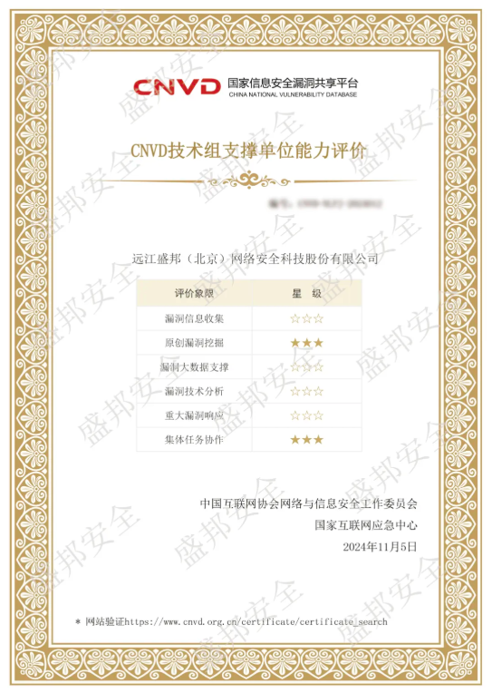 近日,国家信息安全漏洞共享平台(CNVD)发布了年度技术组支撑单位能力评价结果。盛邦安全凭借卓越的漏洞与脆弱性检测及处置能力,在“原创漏洞挖掘”与“集体任务协作”双项评分中荣获满星评价,再次彰显盛邦安全在网络安全领域的专业实力与行业影响力。