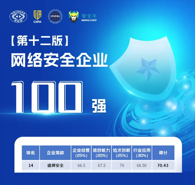 近日,中国计算机学会(CCF)抗恶劣环境计算机专委会、中关村华安关键信息基础设施安全保护联盟、信息产业信息安全测评中心、安全牛联合发布第十二版《网络安全企业100强》。盛邦安全凭借在企业经营、技术创新、行业应用以及信创安全四大能力维度的卓越表现再次入围,位列“中国网络安全百强企业”第14名。