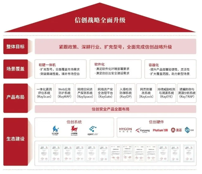 近年来,盛邦安全凭借持续的创新研发和以实际业务场景落地为核心的安全能力,多次承接国家部委以及北京市重点科研课题;同时,公司不断优化产品结构,深化信创战略布局,自主研发了RayOS操作系统,实现了与华为欧拉、麒麟、海光、飞腾、兆芯、申威等主流国产软硬件平台的全面适配,广泛适用于云平台、虚拟化和一体机等多种应用场景,满足了不同行业对信创部署的多样化需求。