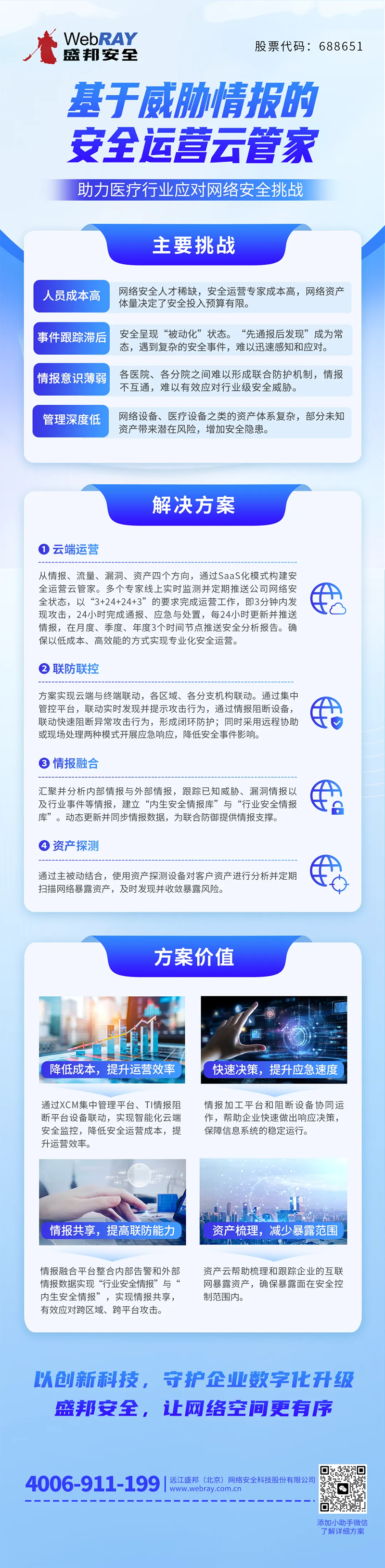 盛邦安全针对医疗行业网络安全建设工作的痛点与挑战,推出了基于威胁情报的SaaS化安全运营模式,帮助行业客户以更加经济、高效的方式,从情报、流量、漏洞、资产四大维度出发,构建一套专业化的安全防护体系,从根本上破解网络安全中的“人力”局限难题。
