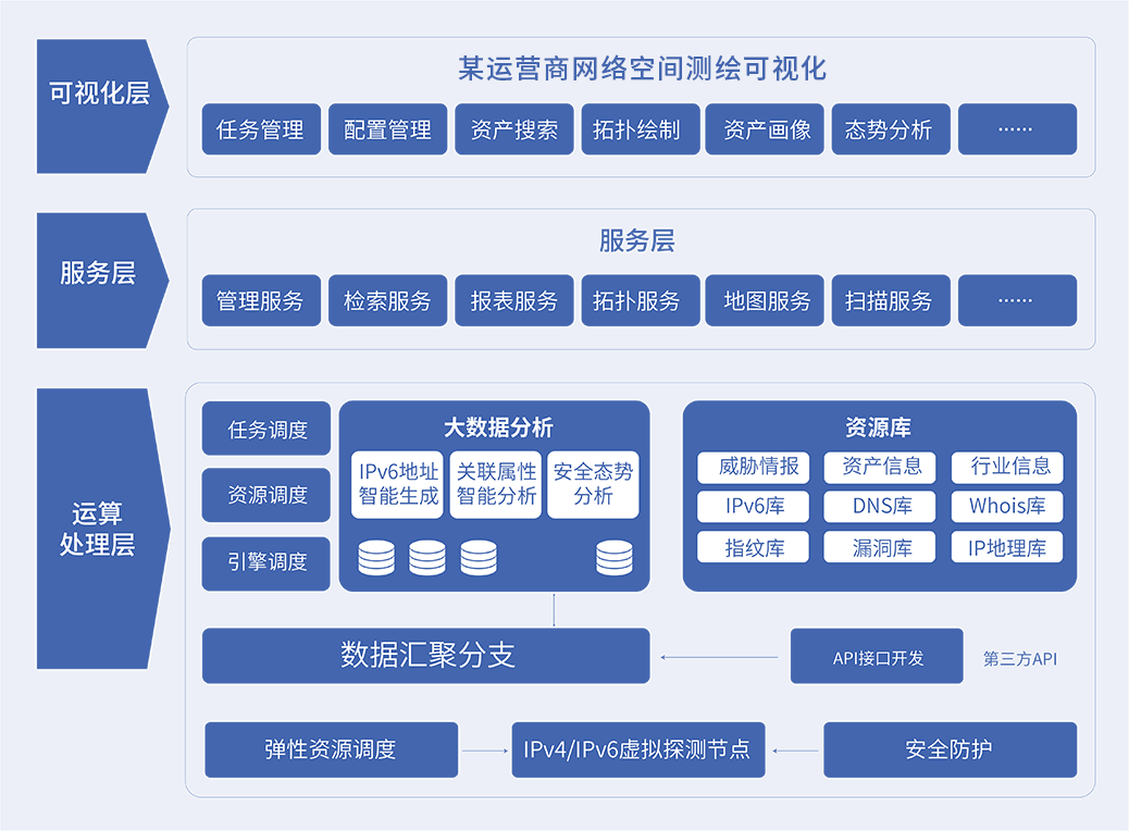本期工程通过建设IPv6网络空间资产测绘平台,主要功能包括IPv6资产可视化、IPv6资产服务、资产数据分析、IPv6资源库等,进一步提升某移动公司的整体IPv6资产发现能力。系统功能架构如下图所示: